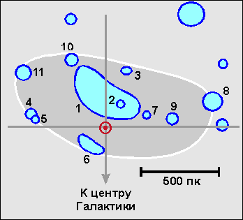 движении по Галактике. Цифрами на карте обозначены основные ассоциации,