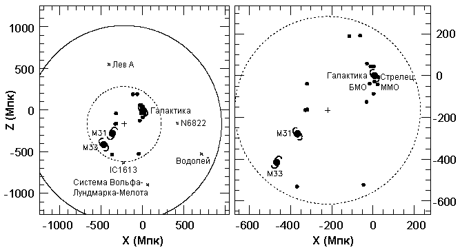 Окружности на рисунке слева имеют радиусы 1.18 Мпк (примерно 3.85 млн. св. лет)