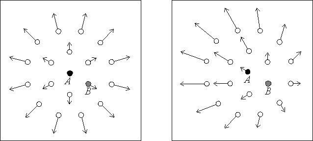 точка наблюдения - галактика А, справа: точка наблюдения - галактика В.
